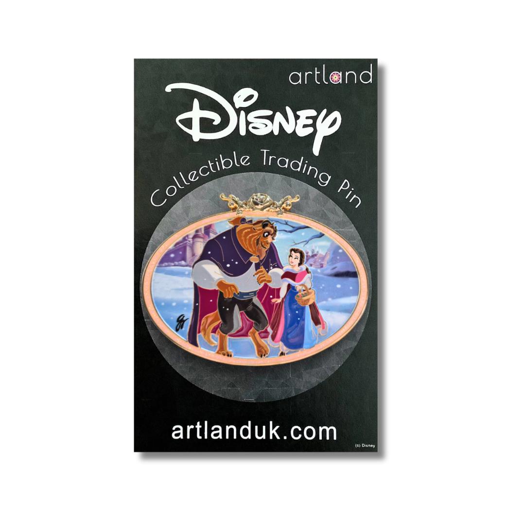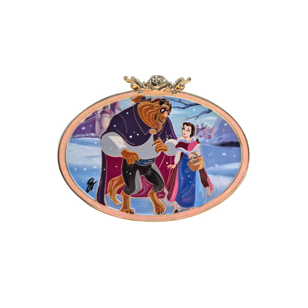 Officially licensed fine art Pins designed by Guy Vasilovich, inspired by Beauty and the Beast. This series of pins feature a beige glitter border with a beautiful shiny gold rose with stems at the top of the pin. This pin is part of the Guy Vasilovich Beauty and the Beast Oval collection. Lovers Winter Walk features Belle and the Beast getting to know each other in the snowy castle grounds.