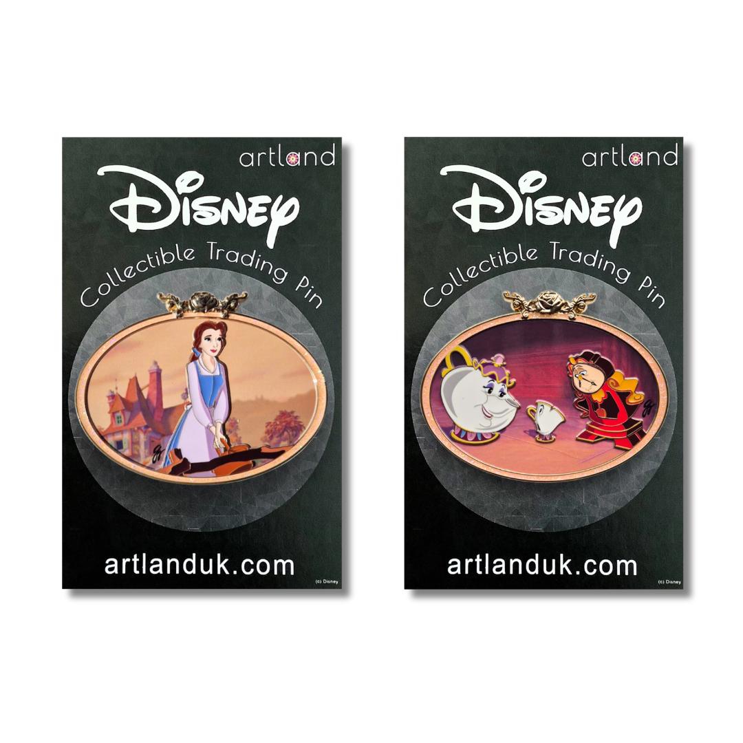 Officially licensed fine art Pins designed by Guy Vasilovich, inspired by Beauty and the Beast. This series of pins feature a beige glitter border with a beautiful shiny gold rose with stems at the top of the pin. This pin is part of the Guy Vasilovich Beauty and the Beast Oval collection.