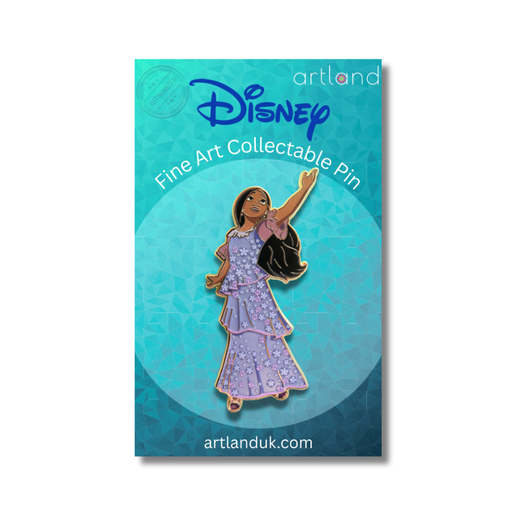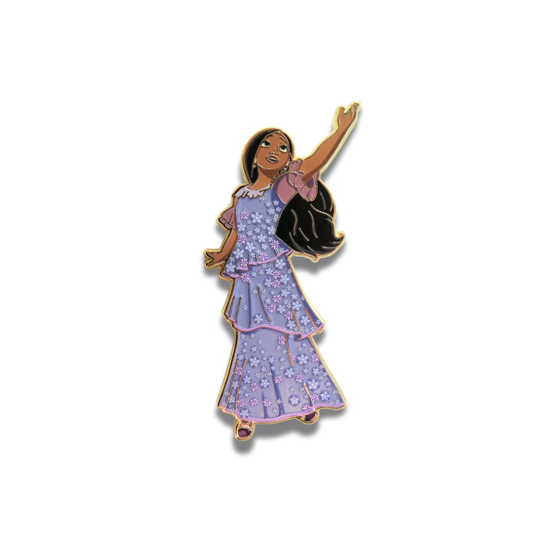 Officially licensed fine art Pins designed by PopCultArt, inspired by One of our first Encanto pins features the beautiful and talented Isabela Madrigal! Isabela is wearing her pearlescent purple dress with screen printed flowers over the top as she wields her powers.