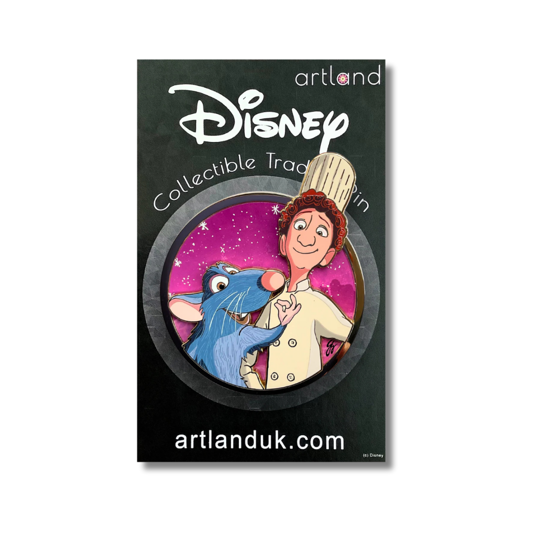 Officially licensed fine art Pins designed by Guy Vasilovich, inspired by Ratatouille. Anyone Can Cook is our first pin of Alfredo Linguini with his best rat-friend Remy! This pin is a Signature pin and has Guy Vasilovich's screen printed signature on the background. This is a pin on pin design with Alfredo smiling and watching Remy chef's kiss as a pin layer on top of a pink starry background..