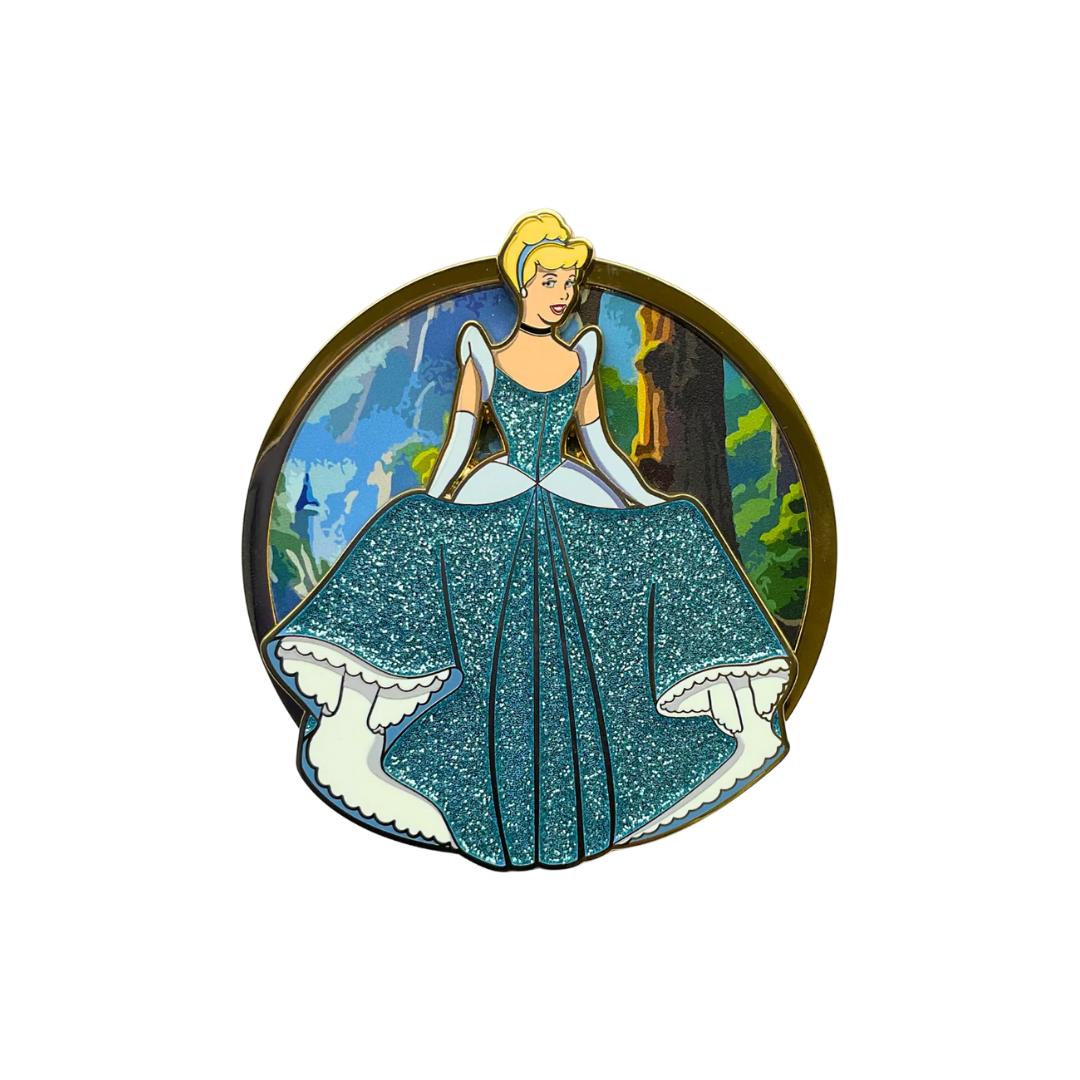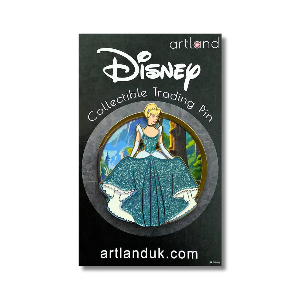 Officially licensed fine art Pins designed by PopCultArt, inspired by Cinderella. This is a pin on pin design featuring Cinderella in her glittering blue ball gown and smiling with a painted forest background..