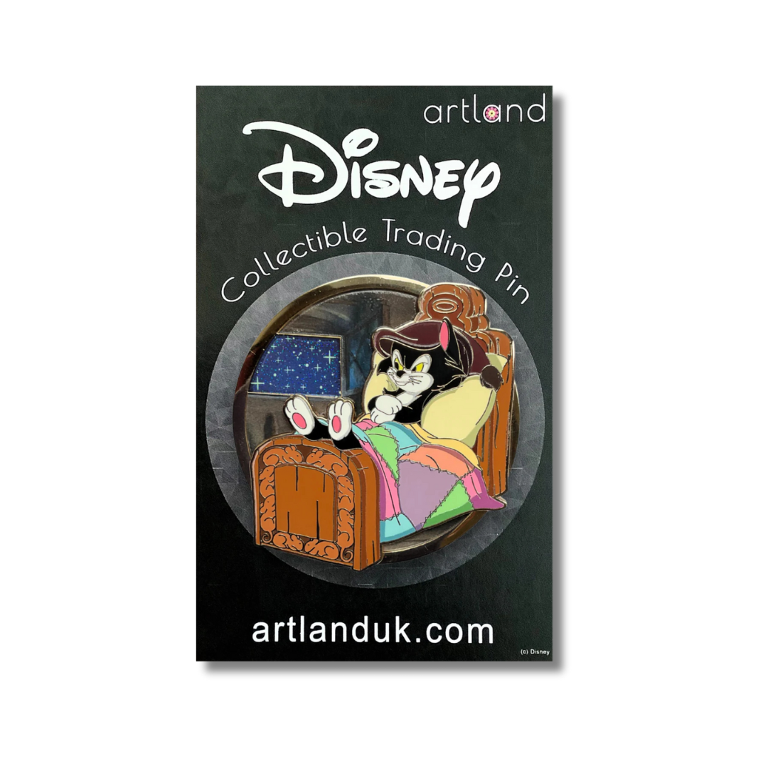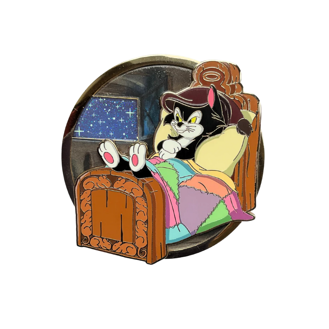 Officially licensed fine art Pins designed by PopCultArt, inspired by Pinocchio. Interrupted Cat Nap is a pin on pin design featuring Figaro looking grumpy in his little bed and patched blanket as a pin layer on top of a background of Gepetto's home with a window to a beautiful, glittering night sky..