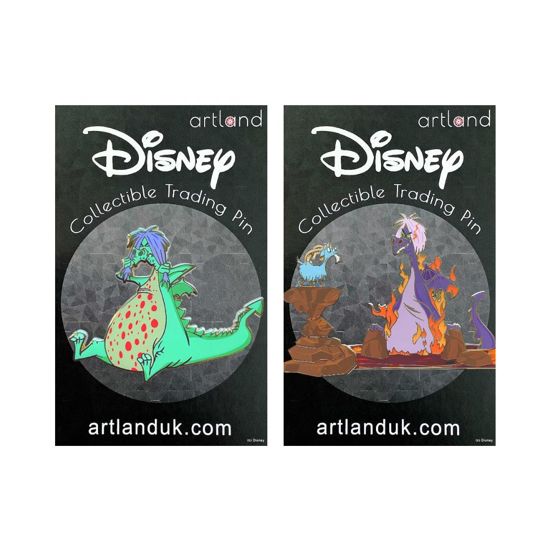 Inspired by the battle between Merlin and Madam Mim in The Sword in the Stone, this pin-on-pin features Merlin in his goat form and Madam Mim as a purple dragon, surrounded by a river of lava. This pin features transparent red elements in the lava.