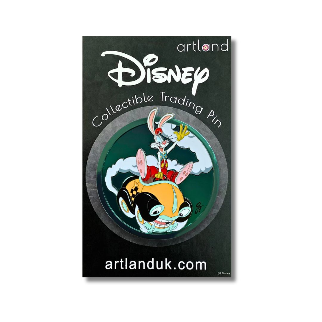 This beautiful pin features a new technique! A brushed blue background gives a patina-like finish, making each pin unique with a stunning vintage feel. This pin showcases Roger Rabbit precariously perched in Benny's driver seat, waving enthusiastically as Benny speeds along, leaving a playful cloud of exhaust behind.