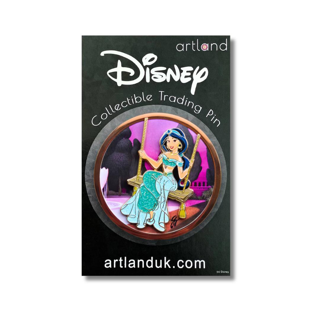 Officially licensed fine art Pins designed by Guy Vasilovich, inspired by Aladdin. The Swing series is a six pin collection designed by Guy Vasilovich and features a screen printing of his signature on the front of every pin. This pin has Jasmine in her glittering two piece swinging on a wooden bench with her palace sprawling behind her..