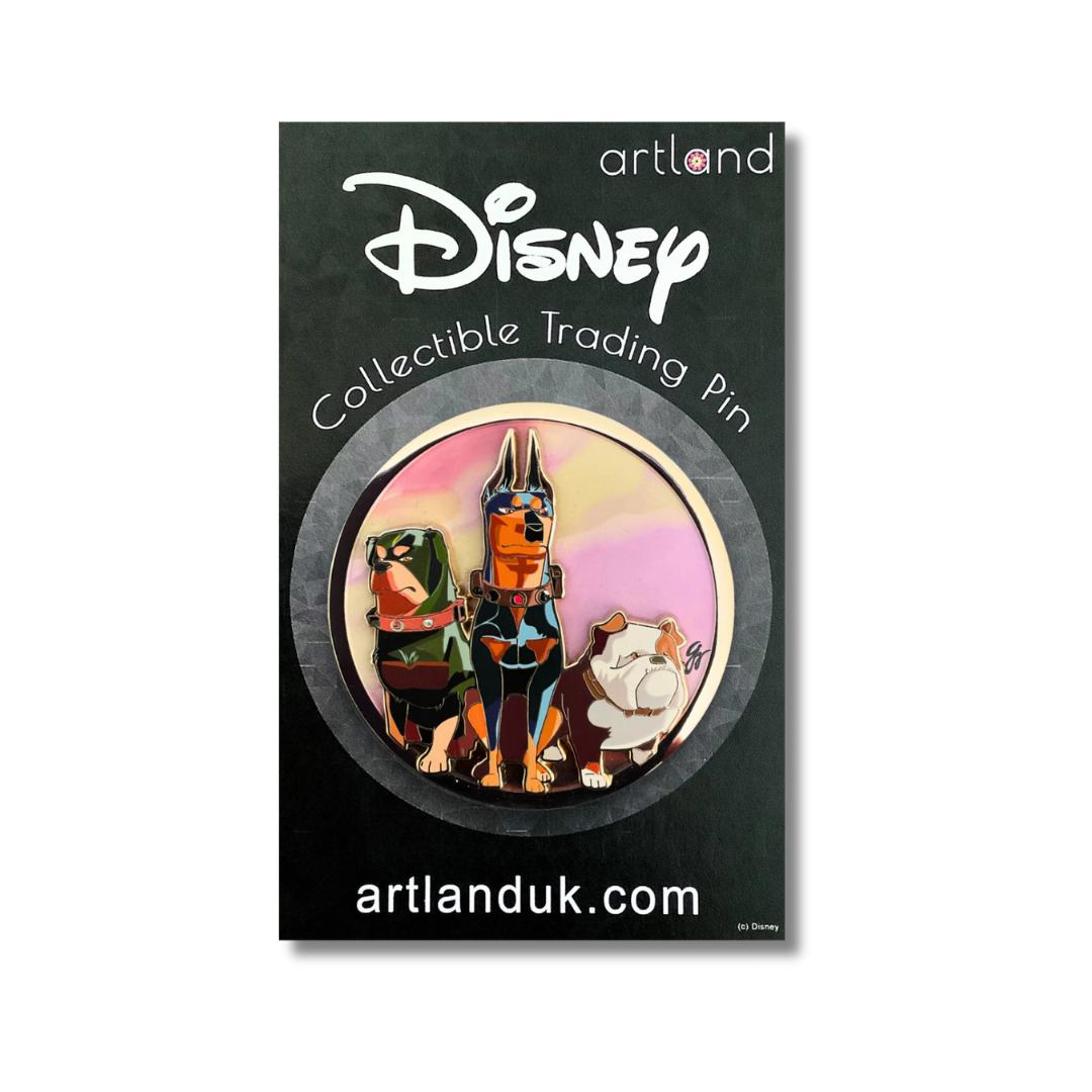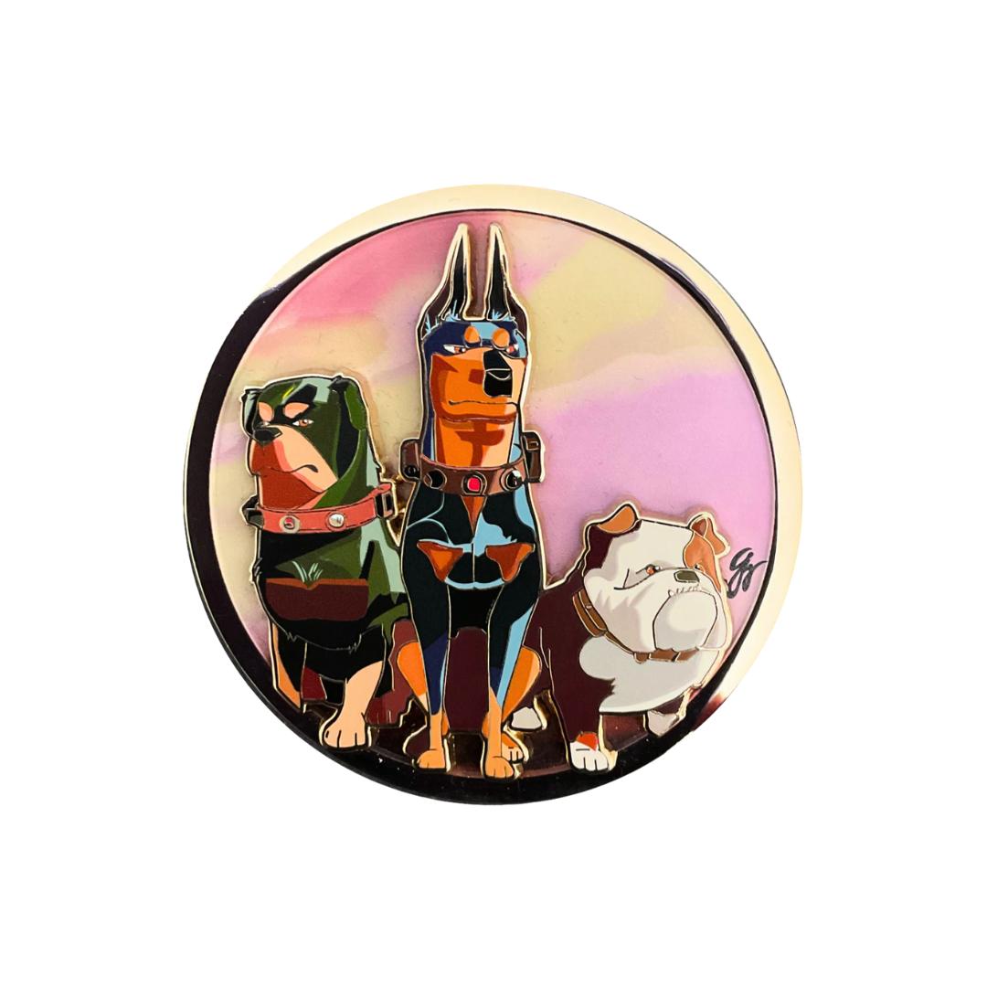 Officially licensed fine art Pins designed by Guy Vasilovich, inspired by Up.  Each pin was designed by Guy Vasilovich's and has a screen print of his signature. Compadres features a beautiful dappled sky, high in the clouds as the three canine henchmen Alpha, Beta and Gamma, sit proudly as a pin layer on top..