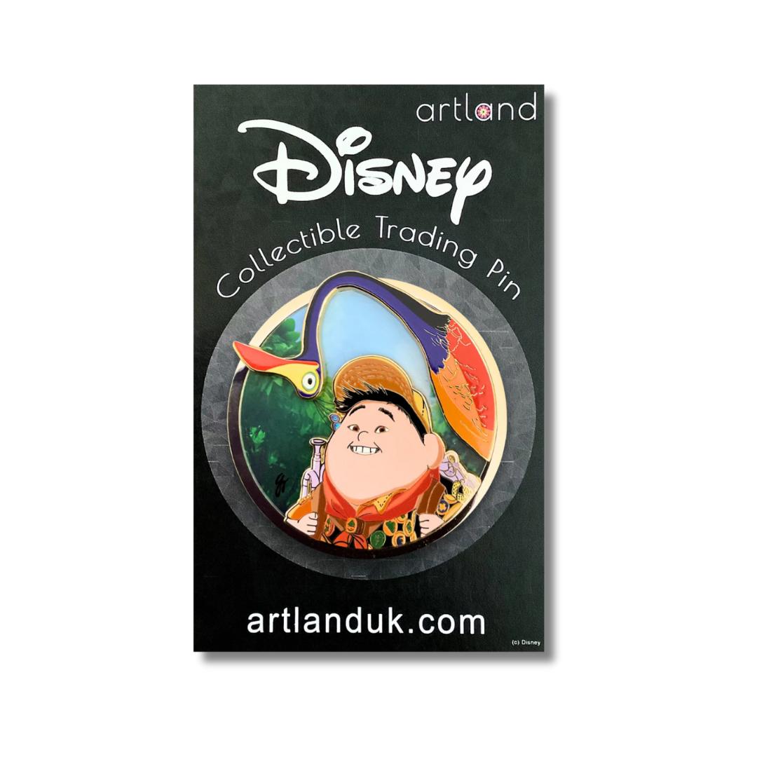 Officially licensed fine art Pins designed by Guy Vasilovich, inspired by Up.  Wilderness Explorers depicts Russell and his best pal Kevin posing as a pin layer on top of a lush green background. Each pin was designed by Guy Vasilovich's and has a screen print of his signature..