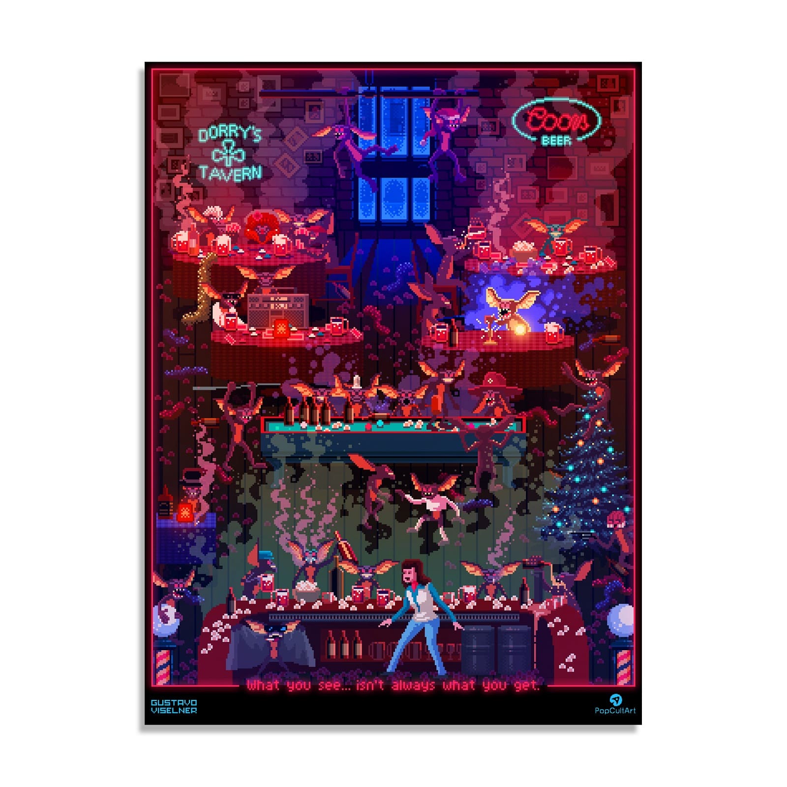 Gustavo's unique pixel art provides a fascinating take on the manic bar scene whilst featuring the many unique Gremlins that appear in the scenes throughout Dorry's Tavern.