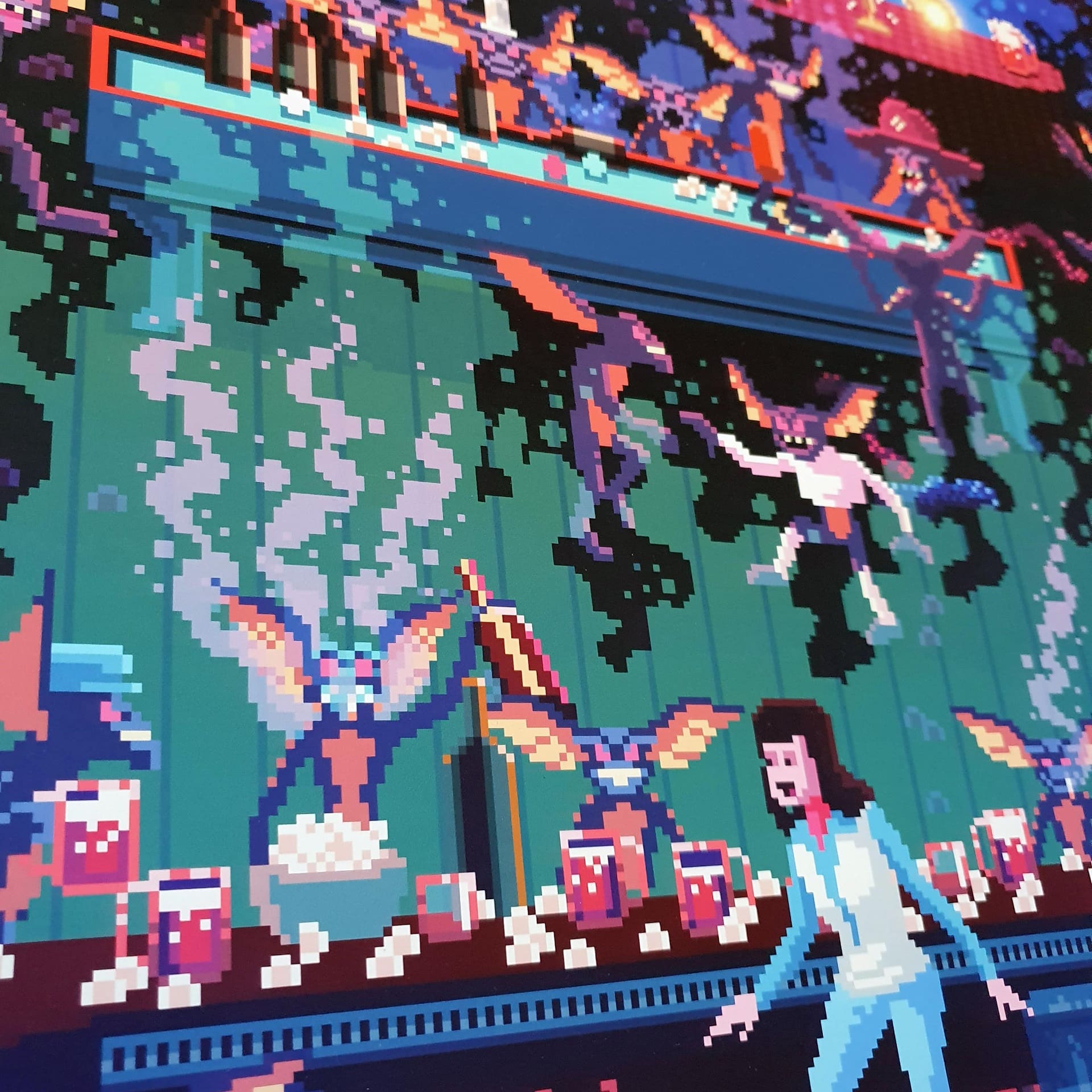 Gustavo's unique pixel art provides a fascinating take on the manic bar scene whilst featuring the many unique Gremlins that appear in the scenes throughout Dorry's Tavern.
