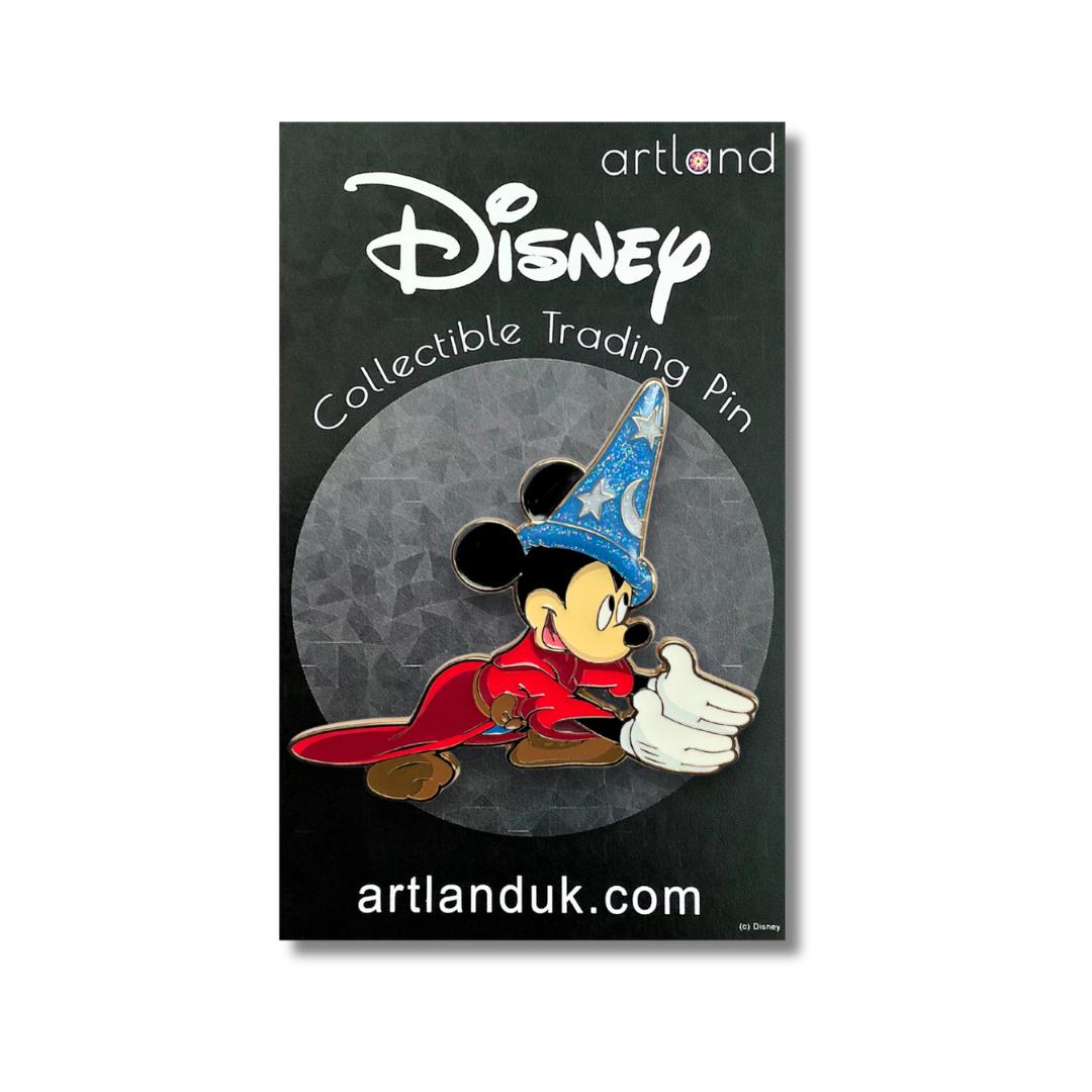 Officially licensed fine art Pins designed by PopCultArt, inspired by Fantasia. Mickey's New Magic depicts one of our favourite moments in Fantasia, when Mickey first puts on his sorcerer's hat and tries to make the broom move. This pin is a true show of quality design with screen printing, chunky glitter and an overfilled effect in Mickey's hat to really make his magic shine..
