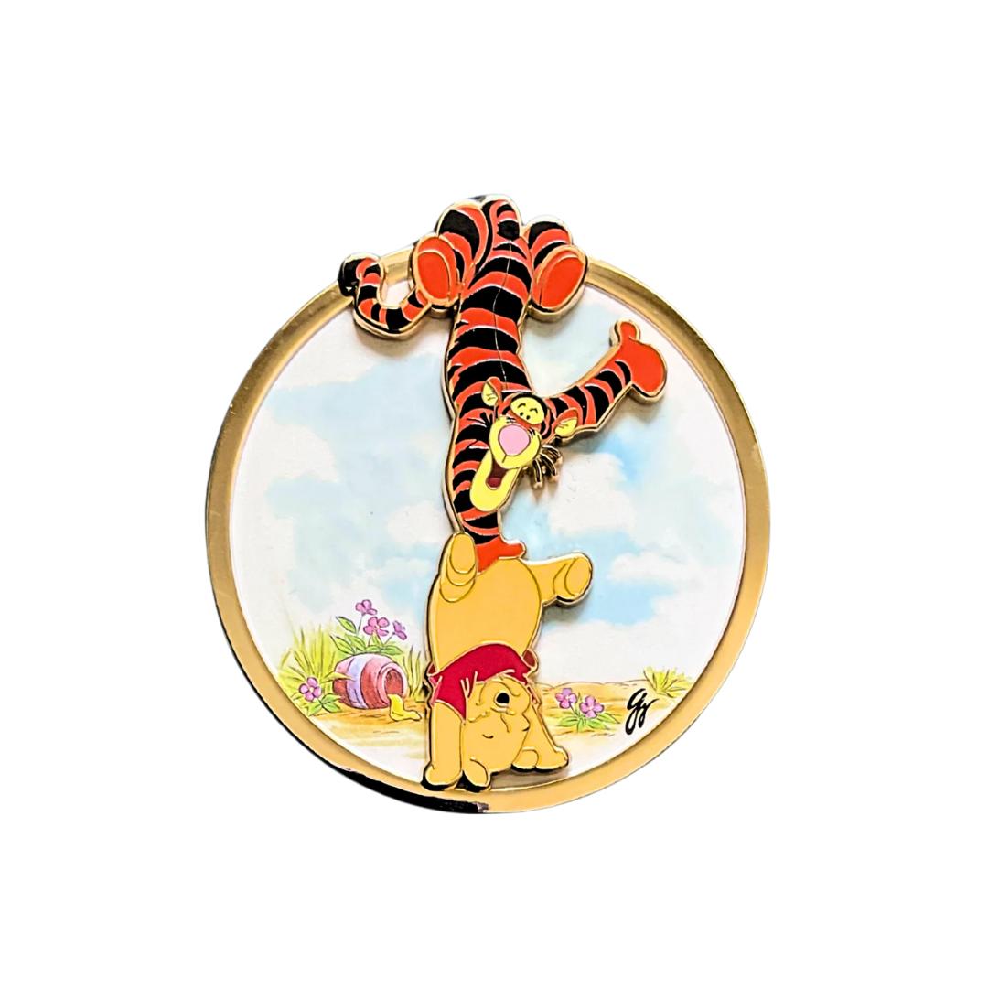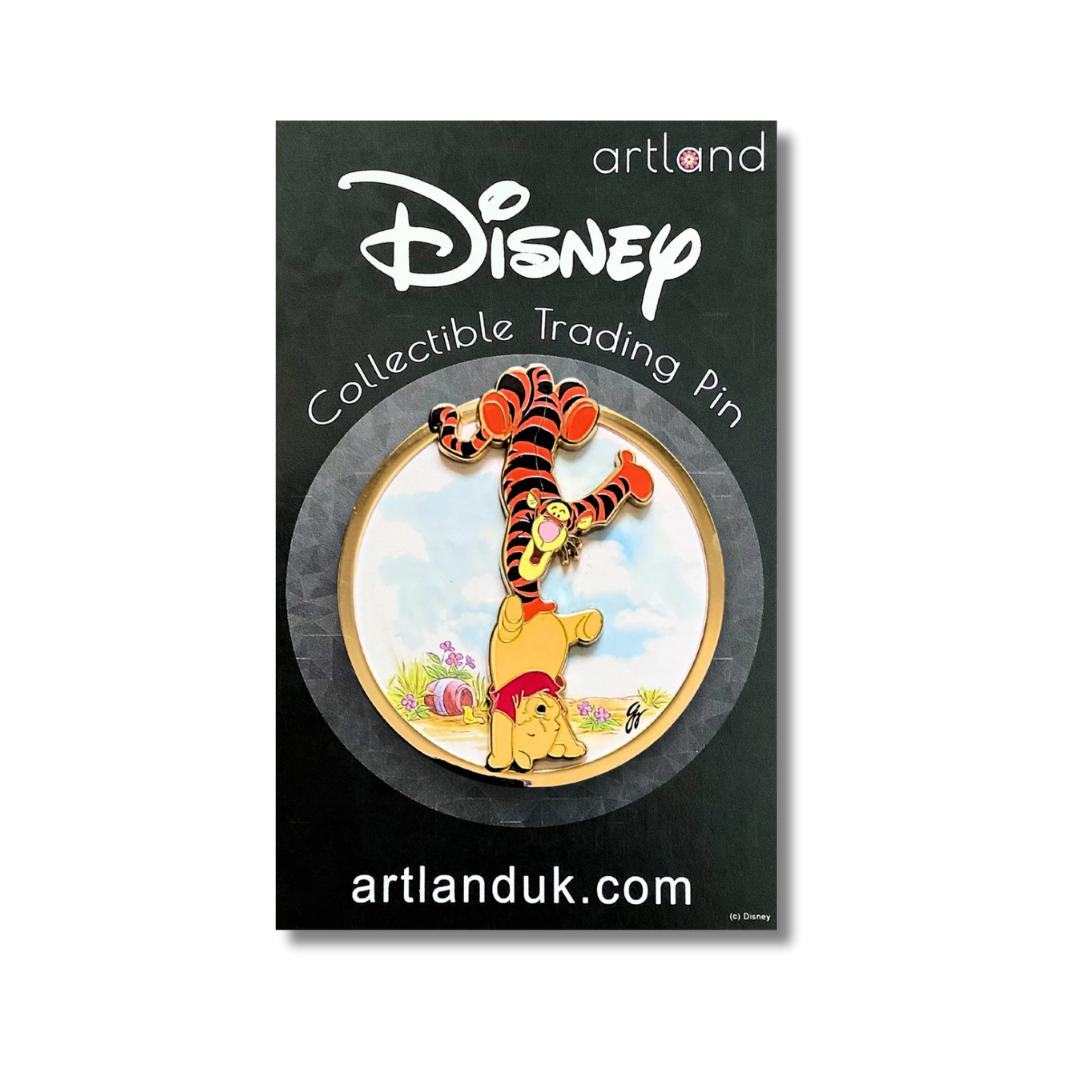 Officially licensed fine art Pins designed by PopCultArt, inspired by Winnie the Pooh. This pin depicts Tigger and Pooh playing together with an acrobatic handstand as a pin layer on top of a nostalgic background of a summer blue sky with a spilling pot of honey!.